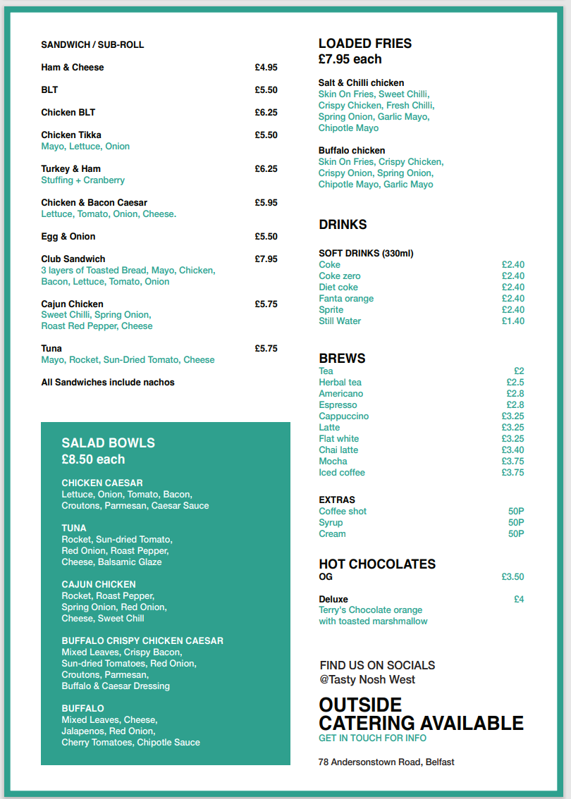 Welcome to Tasty Nosh West, a charming little café nestled at 78 Andersonstown Road in the heart of Belfast. This delightful eatery serves up a rich blend of comfort food with a modern twist, making it an ideal spot for brunch lovers and those seeking a quick yet satisfying bite. With friendly staff and a welcoming atmosphere, Tasty Nosh West feels like a home away from home, where every visit is met with a warm smile.